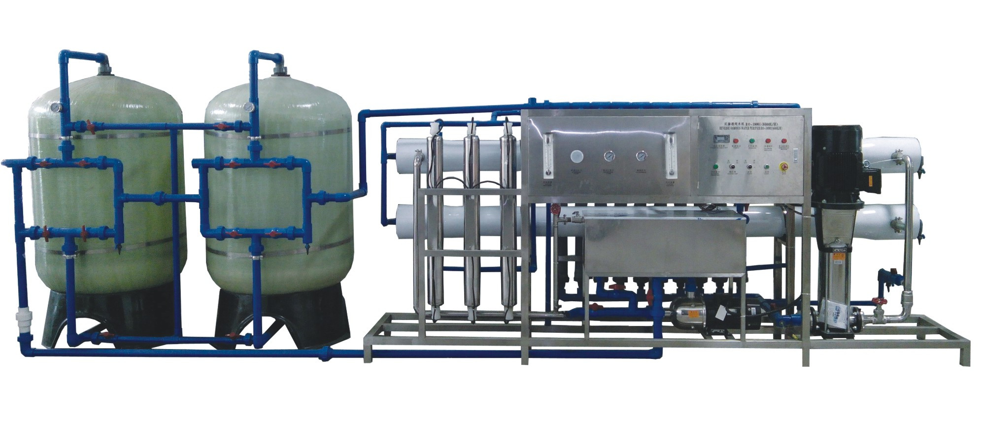 2. High quality TFC compound RO membrane is adopted in water filtration process; the filtration device can work at a low pressure and has a desalinization ration of 98%.